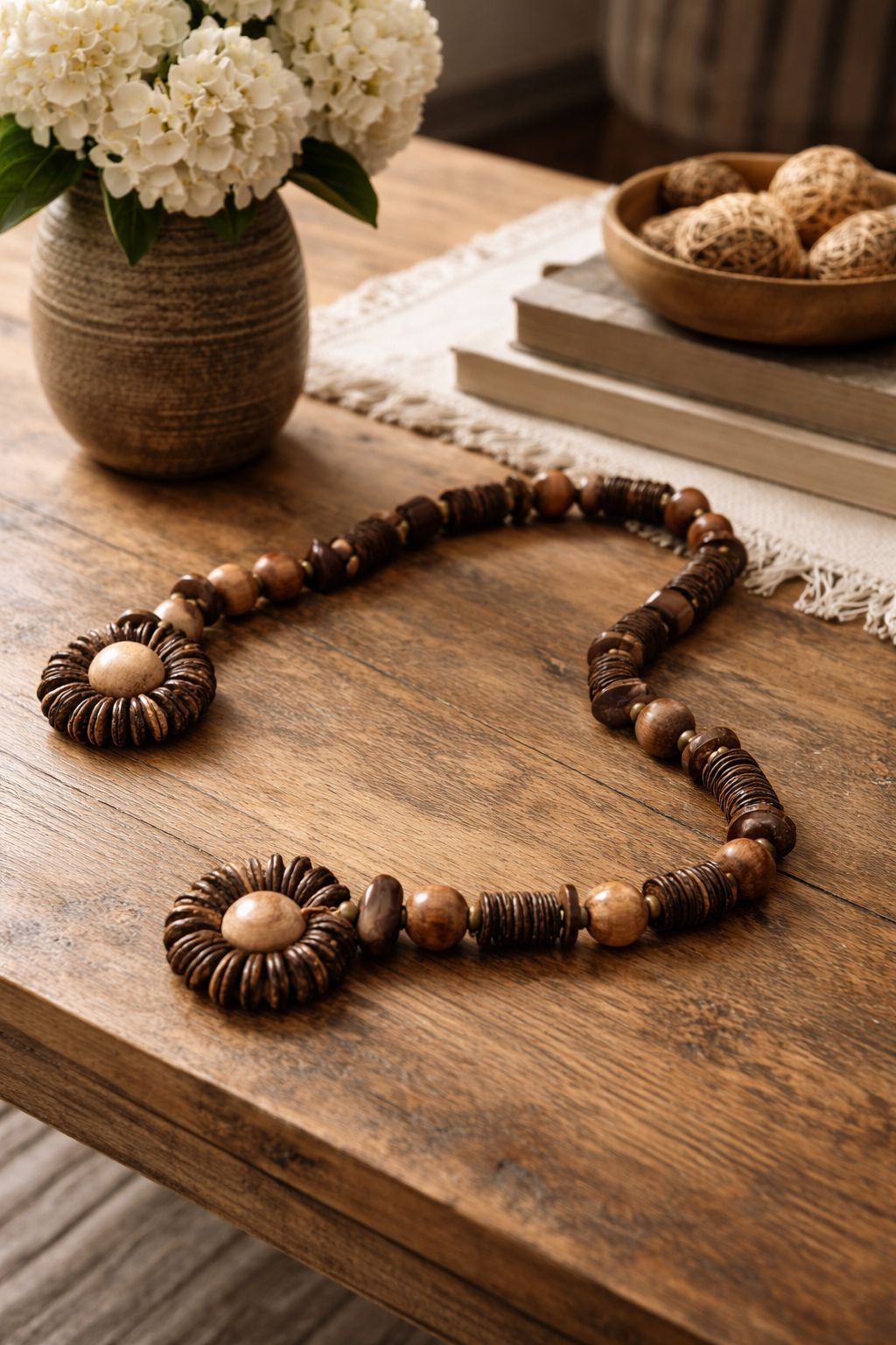 Colar De Mesa Argolas lindo para decorar a sua mesa de jantar ou parede e até mesmo jarros, todo produzido artesanalmente, contas de madeira, de coco e abs.