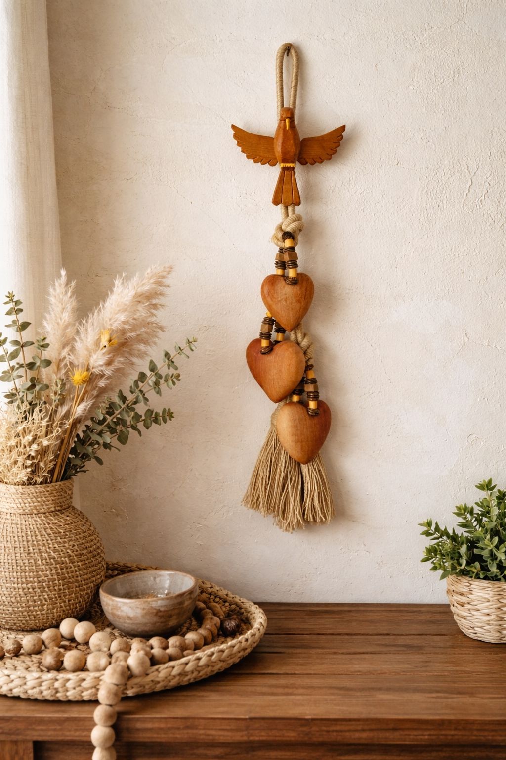 Nosso Divino Penca Coração P é esculpido em madeira maciça, com um divino de 17 cm de asa a asa.