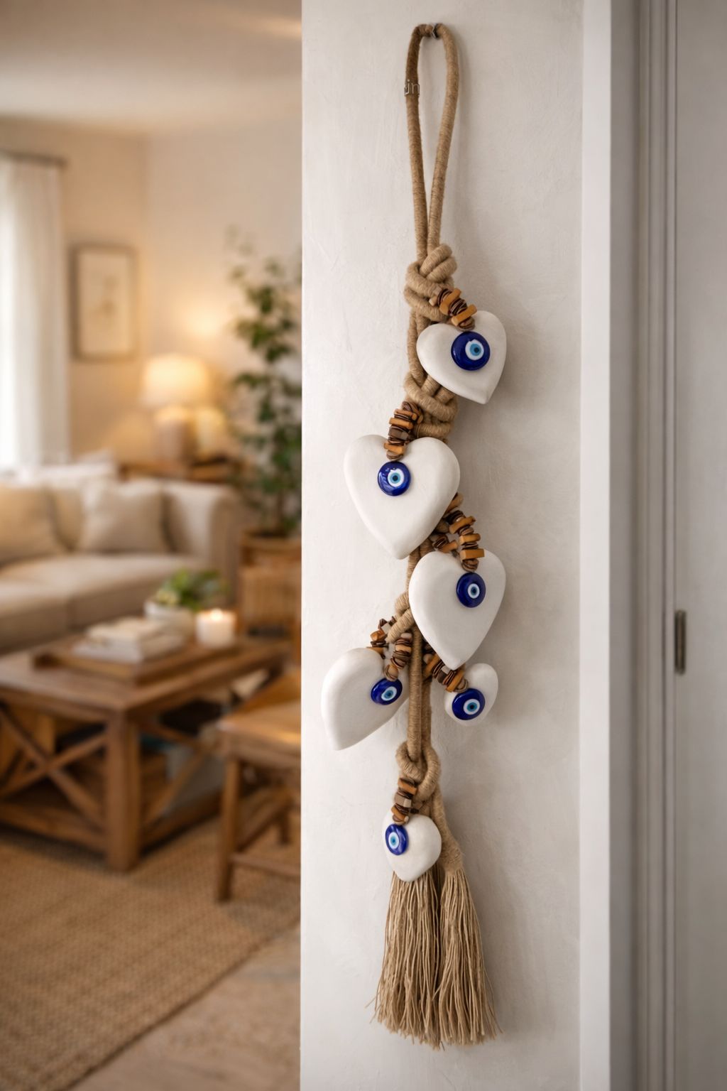 Colar de Mesa/Parede Penca coração olho grego, medindo 1 metro e 10 cm de comprimento, corações esculpidos na madeira, pintados na cor branca, produto 100% artesanal.