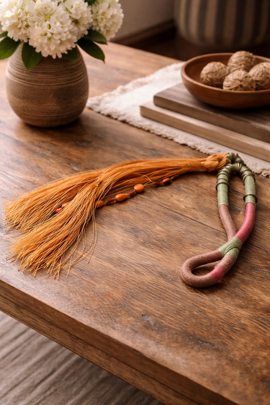 Colar de parede e ou mesa produzido com linha de algodão, linha sintética, resina, pedras e abs
