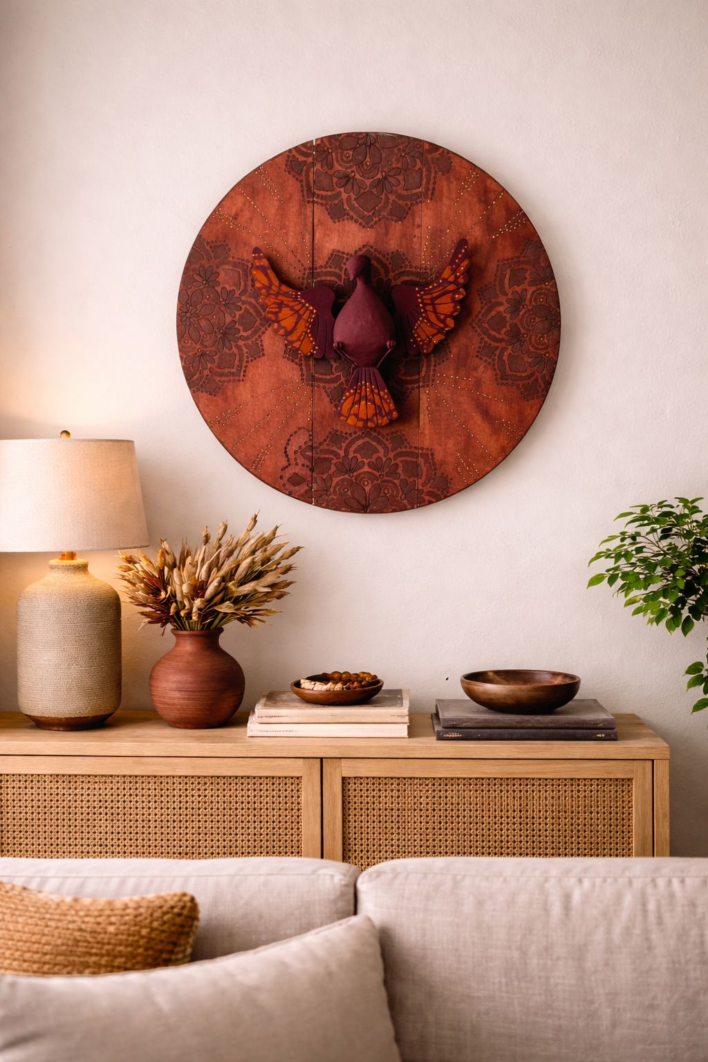 Com 60cm de diâmetro, ela se destaca na decoração, sendo perfeita para salas, halls de entrada, espaços de oração ou ambientes que pedem um toque de espiritualidade com sofisticação rústica.