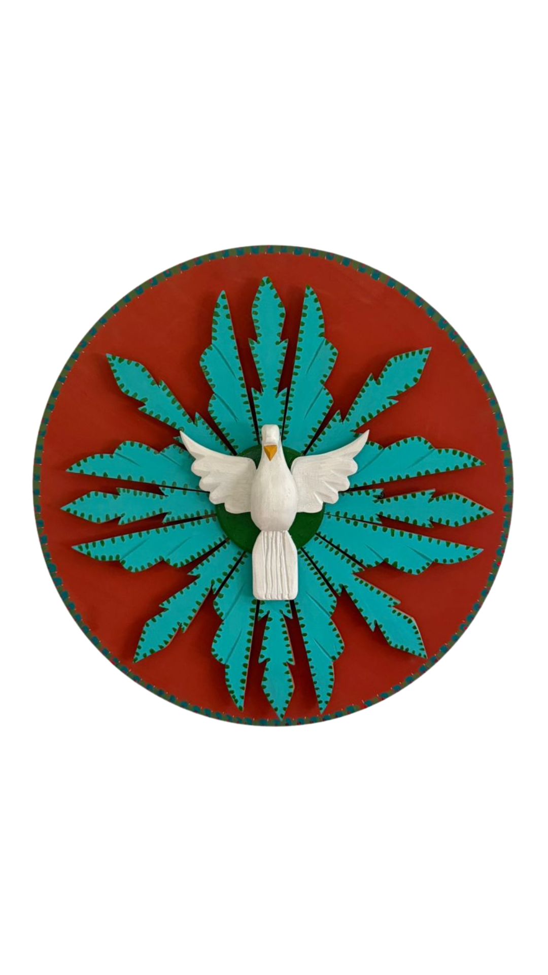 Mandala de 60 cm de diâmetro, produzida em MDF, com resplendor e Divino em madeira maciça, cuidadosamente pintados à mão.