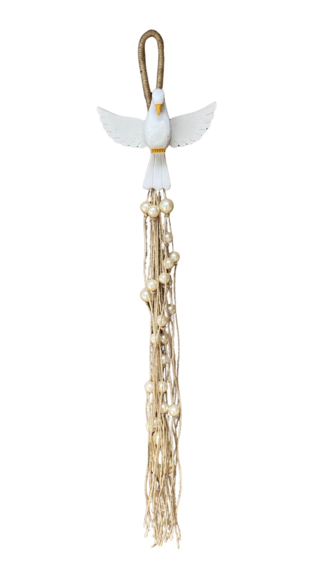 A cauda longa adornada com contas de pérolas traz movimento, brilho suave e um toque sofisticado ao estilo rústico da peça, tornando-o perfeito para compor altares, paredes especiais ou cantinhos de fé e aconchego.