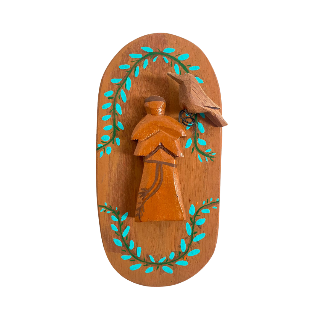 Uma peça delicada e cheia de significado! Este quadrinho com a imagem de São Francisco no centro mede 24 cm de altura por 12 cm de largura, esculpido em madeira maciça e pintado à mão com muito carinho.