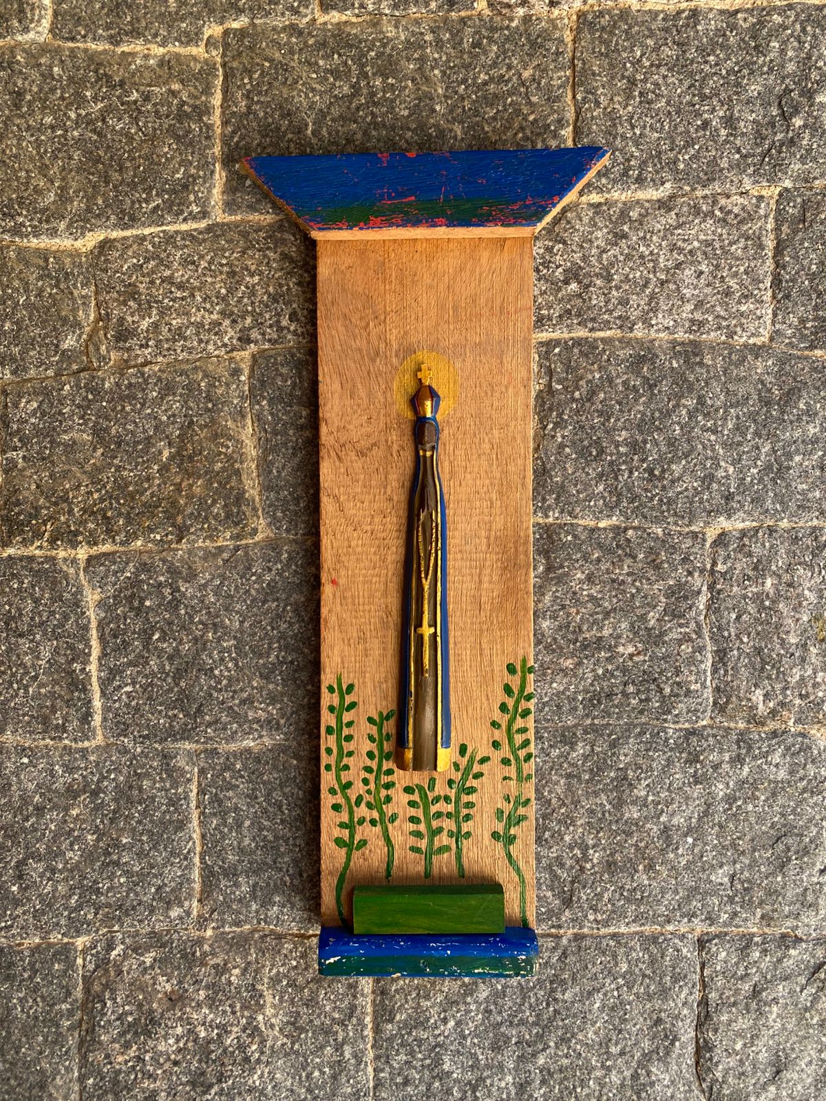 Feito inteiramente em madeira maciça, com aplicação de resina e desenho feito à mão, este quadro une fé, arte e rusticidade em uma peça única.