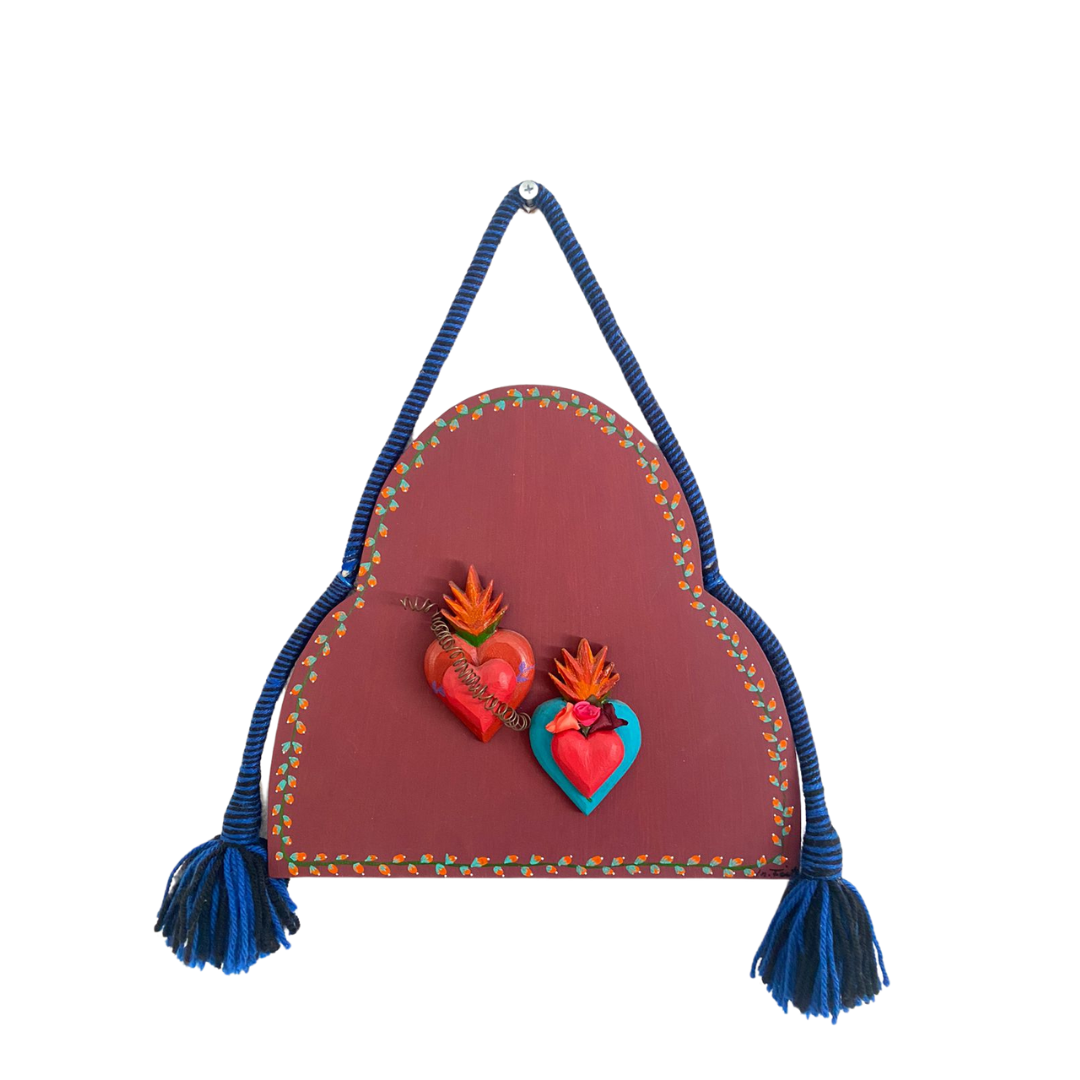 Uma obra cheia de significado e delicadeza, este quadro é esculpido em madeira maciça e apresenta dois corações ao centro, pintados à mão com todo cuidado. O tassel azul e preto nas laterais confere um toque elegante e único à peça. Com 45 cm de altura por 30 cm de largura, é uma obra que traz espiritualidade e sofisticação ao seu ambiente.